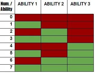 Here is an example of storing Abilities 1, 2 & 3 in the 10s digit of the Red channel :