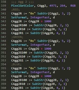 Here we read a pixel on screen and store the digit into a variable. Ex : CAgg2G100 would be the green value of a pixel in the 100s
